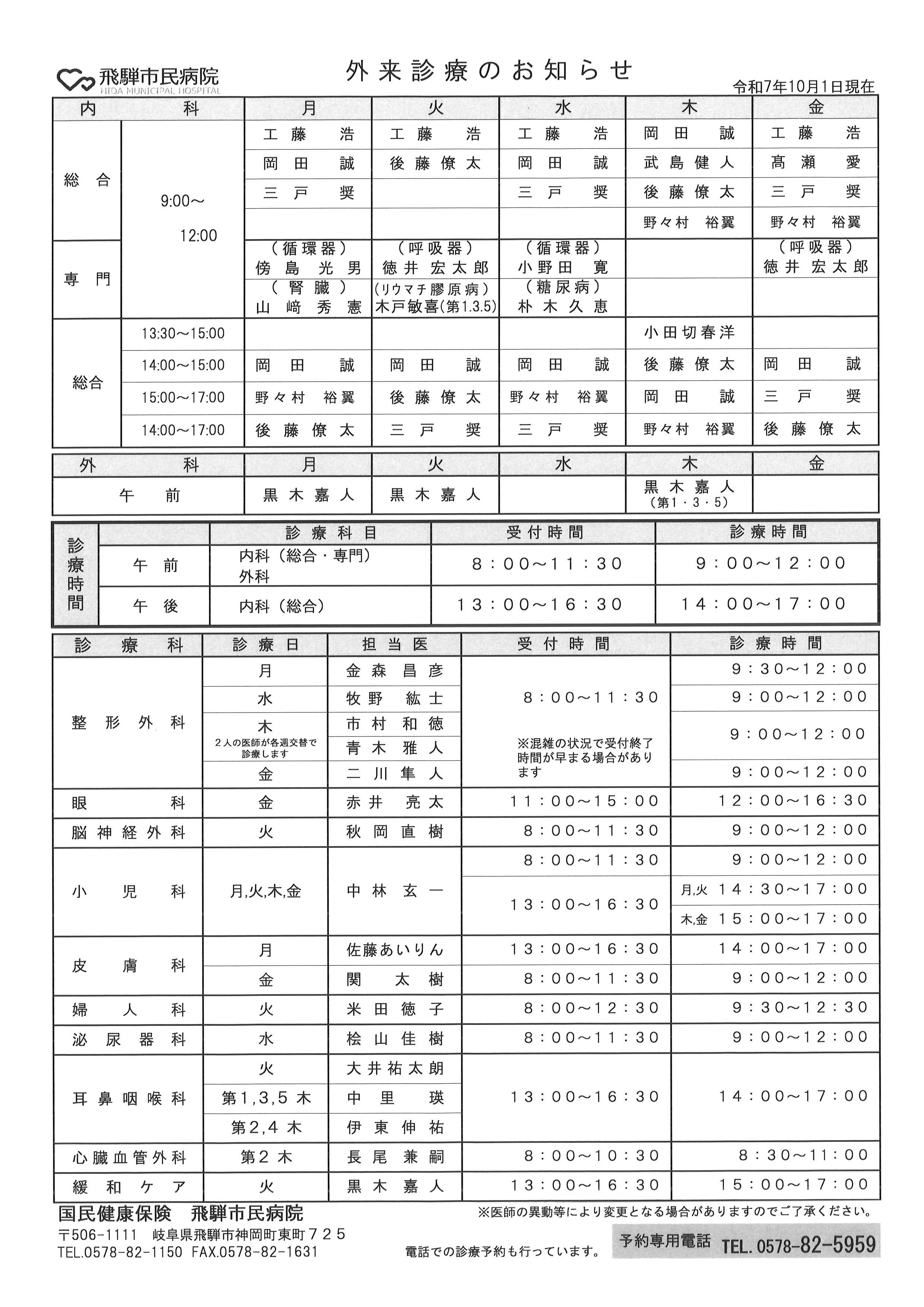 外来診療のお知らせ(令和7年10月1日現在) PDFファイルはこちら をご覧ください。 休診・代診のご案内 休診・代診については、こちらをご覧ください。 休診・代診情報については随時更新しておりますが、更新が間に合わない場合もありますので予めご了承ください。 お電話(0578-82-1150)にてご確認いただければ最新の情報をご案内いたします。