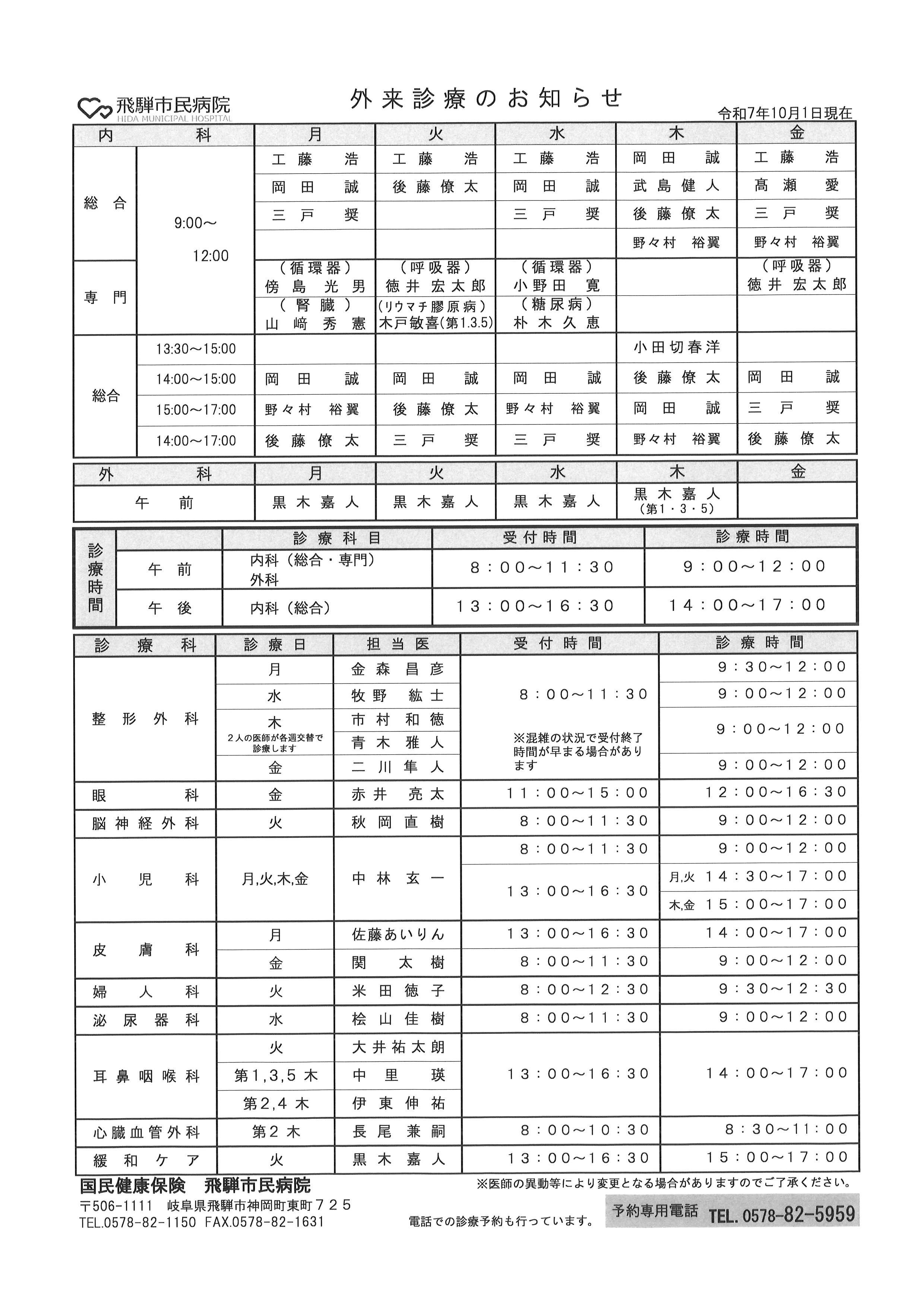 外来診療のお知らせ(令和7年10月1日現在) PDFファイルはこちら をご覧ください。 休診・代診のご案内 休診・代診については、こちらをご覧ください。 休診・代診情報については随時更新しておりますが、更新が間に合わない場合もありますので予めご了承ください。 お電話(0578-82-1150)にてご確認いただければ最新の情報をご案内いたします。